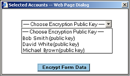 If encryption is required, the second pair of javascripts will ask the user to confirm what users public key should be used to encrypt the data and once selected, only that user can decrypt the information submitted.